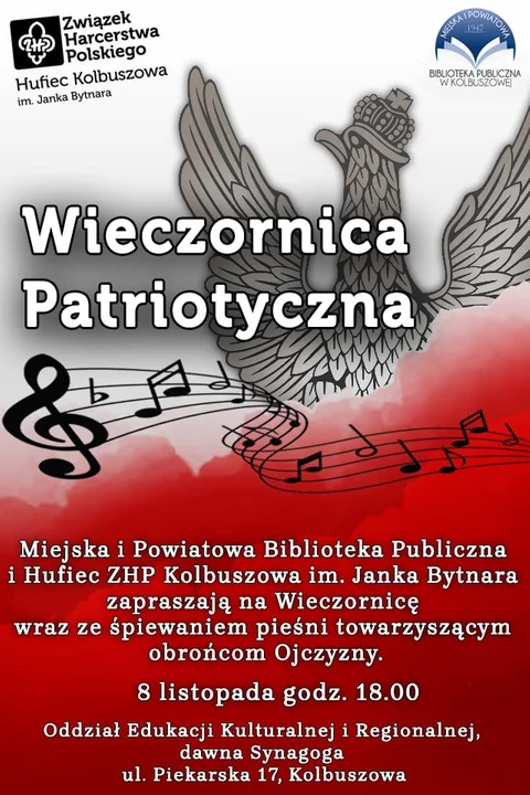 W sobotni wieczór, 8 listopada o godz. 18.00, w dawnej synagodze przy ul. Piekarskiej odbędzie się Wieczornica Patriotyczna. Miejska i Powiatowa Biblioteka Publiczna oraz Hufiec ZHP im. Janka Bytnara zaproszą uczestników do wspólnego śpiewania pieśni towarzyszących obrońcom Ojczyzny. Wydarzenie zapowiada się wyjątkowo nastrojowo i refleksyjnie – będzie to okazja do zadumy i wspólnego przeżywania historii w atmosferze harcerskiej tradycji.