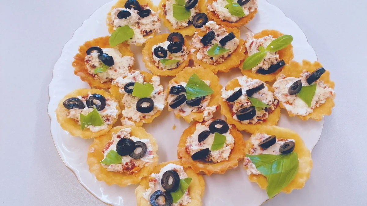 Przygotowaną pastą nadziej gotowe kruche babeczki. Przyozdobić pokrojonymi w paseczki papryka, plasterkami czarnych oliwek oraz listkami bazylii. Podawać na zimno.