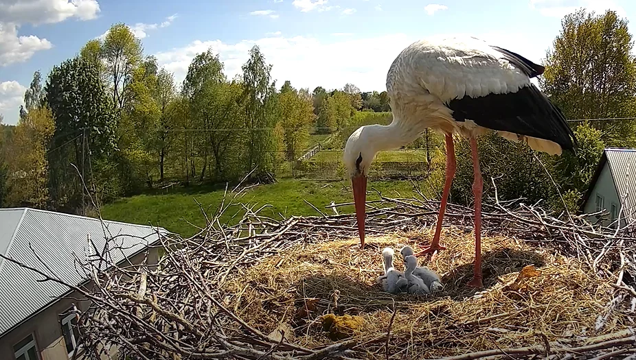 Dzięki zainstalowanej kamerze przy gnieździe internauci mają możliwość obserwowania takich scen z życia bocianiej pary. To niezwykłe urządzenie umożliwia im śledzenie troskliwej opieki, jaką para ptaków poświęca swoim młodym.