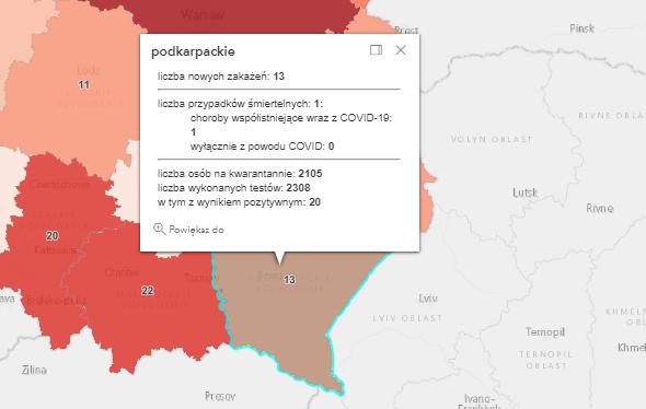 Zakażenia na Podkarpaciu według powiatów: