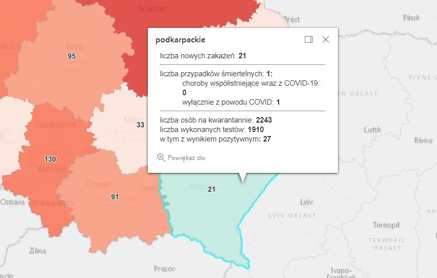Zakażenia na Podkarpaciu według powiatów: