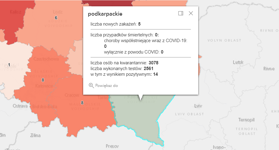 5 zakażeń to dane bez wskazania adresu, które zostaną uzupełnione przez inspekcję sanitarną. Z powodu Covid-019 zmarło 5 osób, natomiast z powodu współistnienia Covid-19 z innymi schorzeniami zmarło 13 osób.