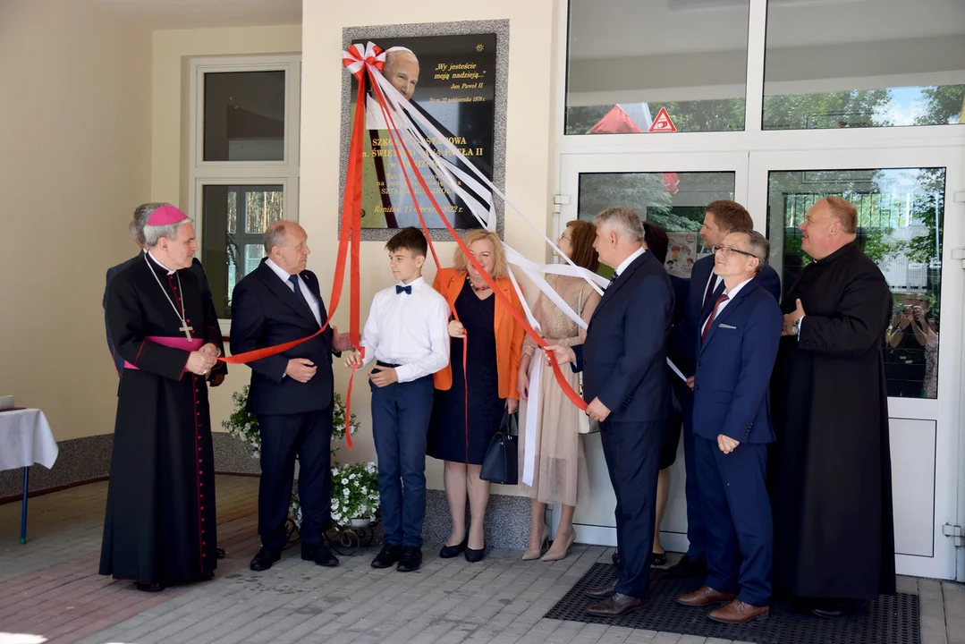 Po Eucharystii odbył się uroczysty przemarsz przed budynek Szkoły Podstawowej im. Jana Pawła II w Raniżowie, gdzie bp Nitkiewicz poświęcił tablicę upamiętniającą nadanie sztandaru szkoły.