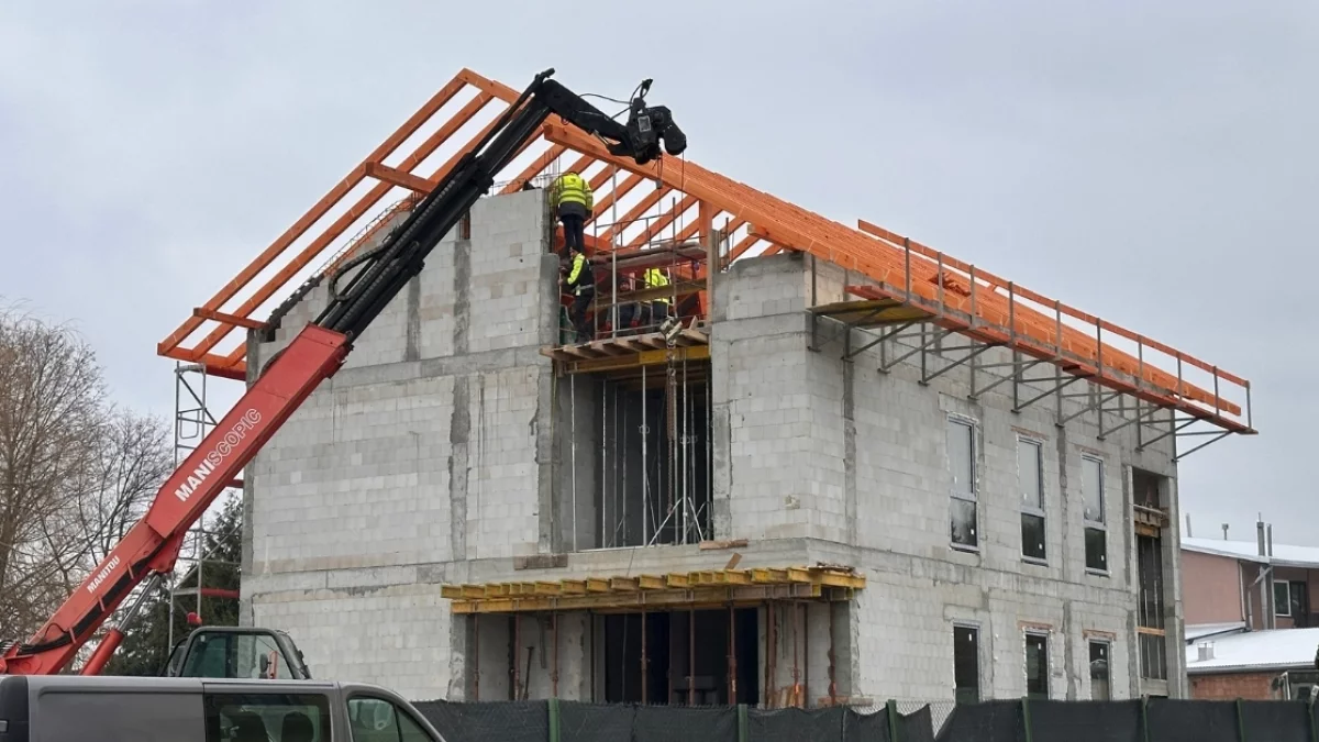 W poniedziałek, 29 grudnia, byliśmy na miejscu, by sprawdzić postęp robót przy powstającym budynku nowej siedziby Powiatowego Inspektoratu Weterynarii. Z budowy wyraźnie widać, że inwestycja znajduje się już w stanie surowym otwartym. Obiekt ma w pełni ukształtowaną bryłę – wymurowane zostały ściany nośne i działowe, wykonano stropy, a obecnie trwa montaż konstrukcji dachu. Prace prowadzone są z użyciem dźwigu, który służy do ustawiania elementów więźby dachowej.