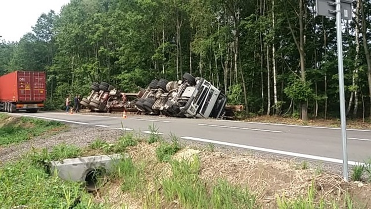 Ciężarówka przewożąca drewno zjechała do rowu i przewróciła się na bok. Ruch odbywa się wahadłowo, zablokowany jest pas ruchu w kierunku Dzikowca. Na miejscu pracują strażacy, ratownicy medyczni i policjanci.