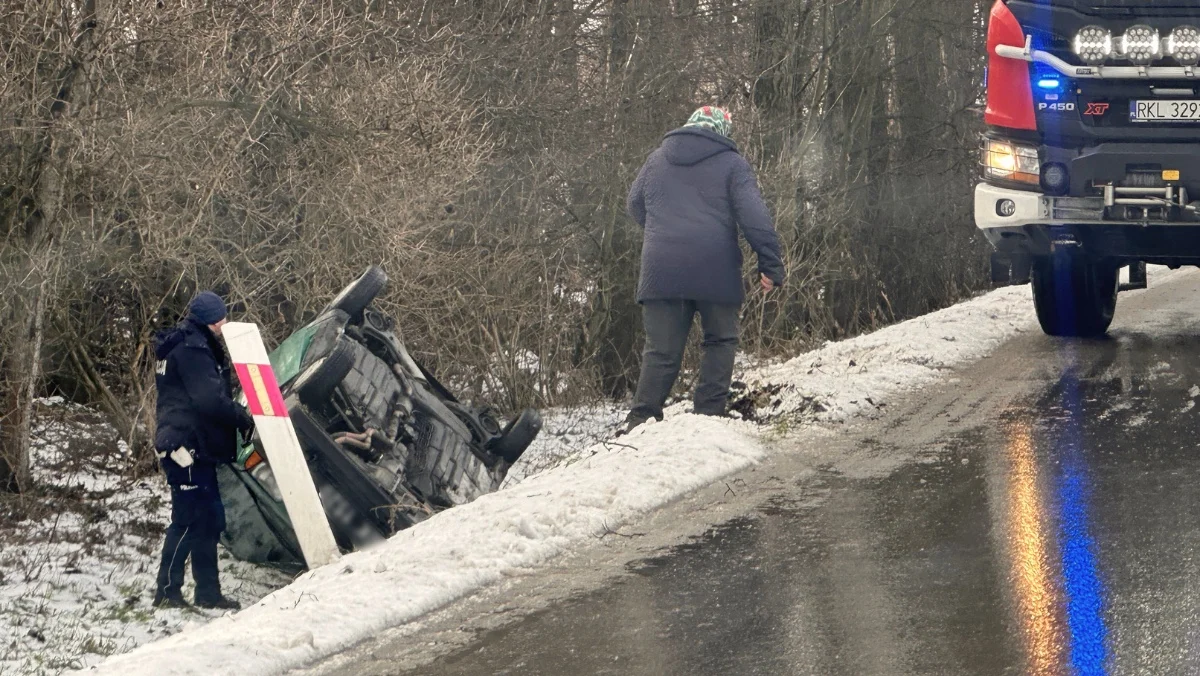Samochód wypadł z drogi na zakręcie. Fot. K. Ząbczyk (2)