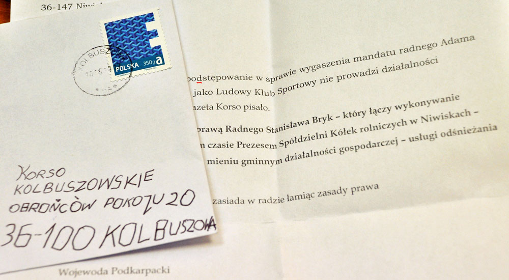 Do naszej redakcji dotarł list. Pismo jest datowane na 1 maja. Nie ma podpisów: widnieje tylko komputerowo napisane: mieszkańcy i radni gminy Niwiska. Czytamy w nim: "Jak wiadomo, toczyło się postępowanie w sprawie wygaszenia mandatu radnego Adama Chlebowskiego. Wiadomo było, że ludowy klub sportowy nie prowadzi działalności gospodarczej. Niech wojewoda zajmie się sprawą radnego Stanisława Bryka, który łączy wykonywanie mandatu radnego, będąc jednocześnie prezesem Spółdzielni Kółek Rolniczych w Niwiskach i wykonywaniem na mieniu gminnym działalności gospodarczej: usługi odśnieżania i innych w latach 2014-17. Straszne jest, że w dalszym ciągu zasiada w radzie, łamiąc prawa".