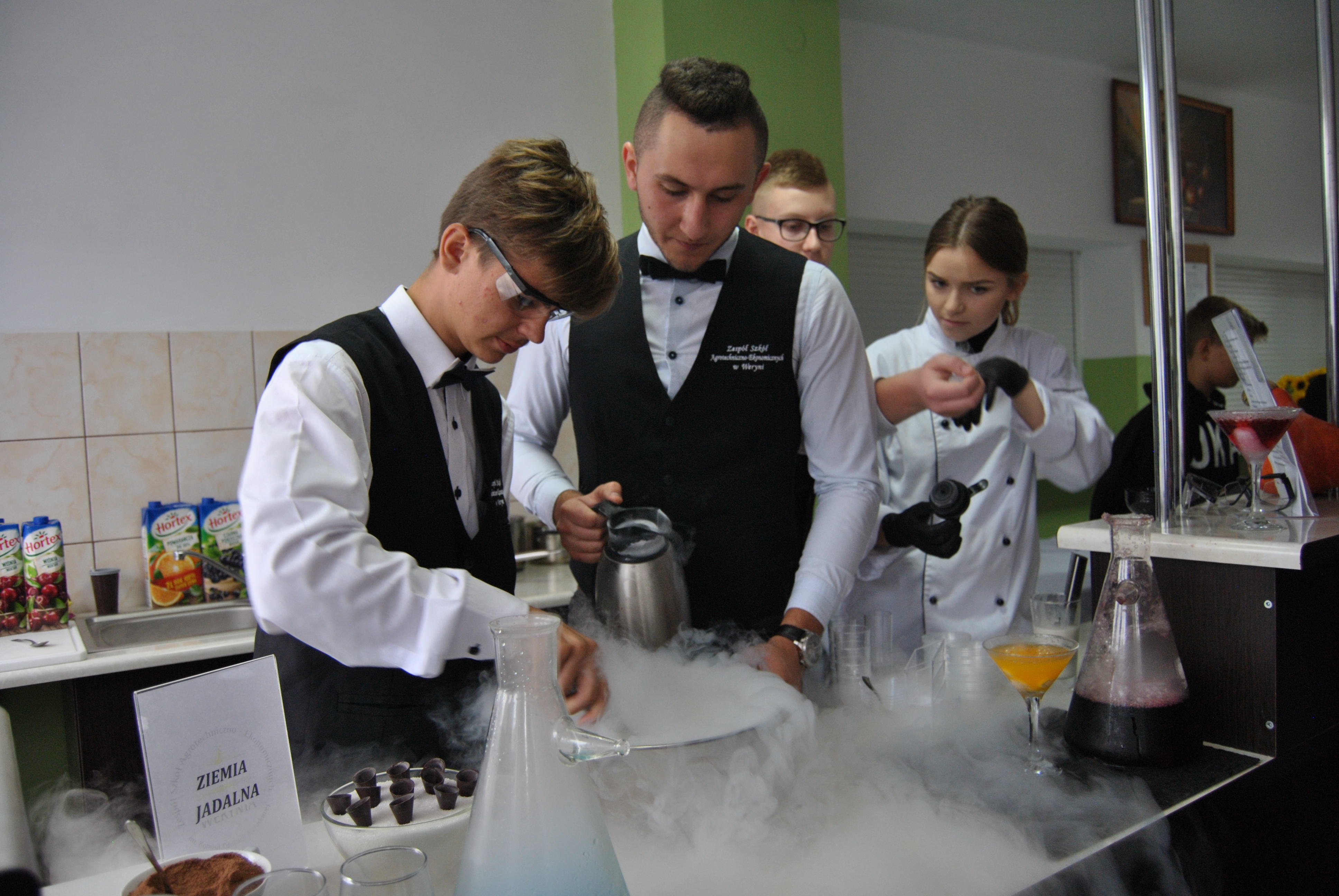 Wielkim show były pokazy molekularne w trakcie których uczniowie używali ciekłego azotu i suchego lodu do przygotowania lodów, sorbetów, napojów, musów i mnóstwa innych deserów. Kuchnia molekularna budzi duże zainteresowanie, już samo to pojęcie sugeruje nam, że na naszych pokazach nie ma co liczyć na tradycyjnego schabowego.