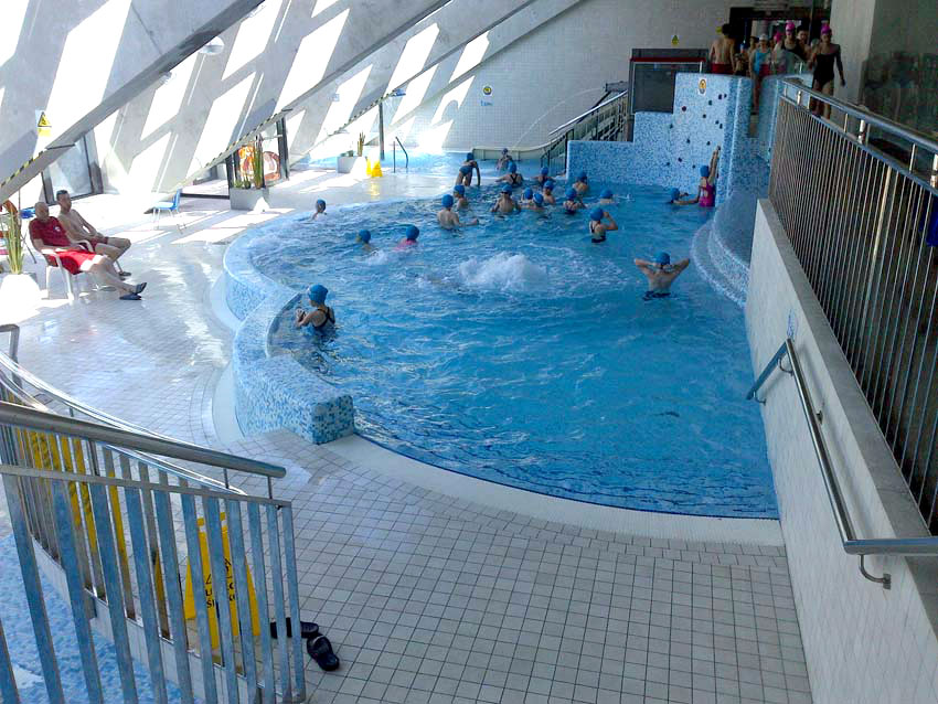 Różnych basenów tutaj nie brakuje: jest olimpijski 50-metrowy z ruchomym dnem (trybuny mogą pomieścić 2100 widzów), są rekreacyjne, a także zewnętrzne oraz z hydromasażem. Basen olimpijski umożliwia rozgrywanie zawodów pływackich na poziomie międzynarodowym wysokiej rangi na krótkich i długich dystansach oraz rozgrywek piłki wodnej. Dwie zjeżdżalnie zewnętrzne mają długość 76 m oraz 116 m, zaś wewnętrzna zjeżdżalnia rodzinna 9 m. Zewnętrzny odkryty basen całoroczny ma podgrzewaną wodę. Niesamowite wrażenie robi również szyba umożliwiająca oglądanie basenu „od spodu”.
