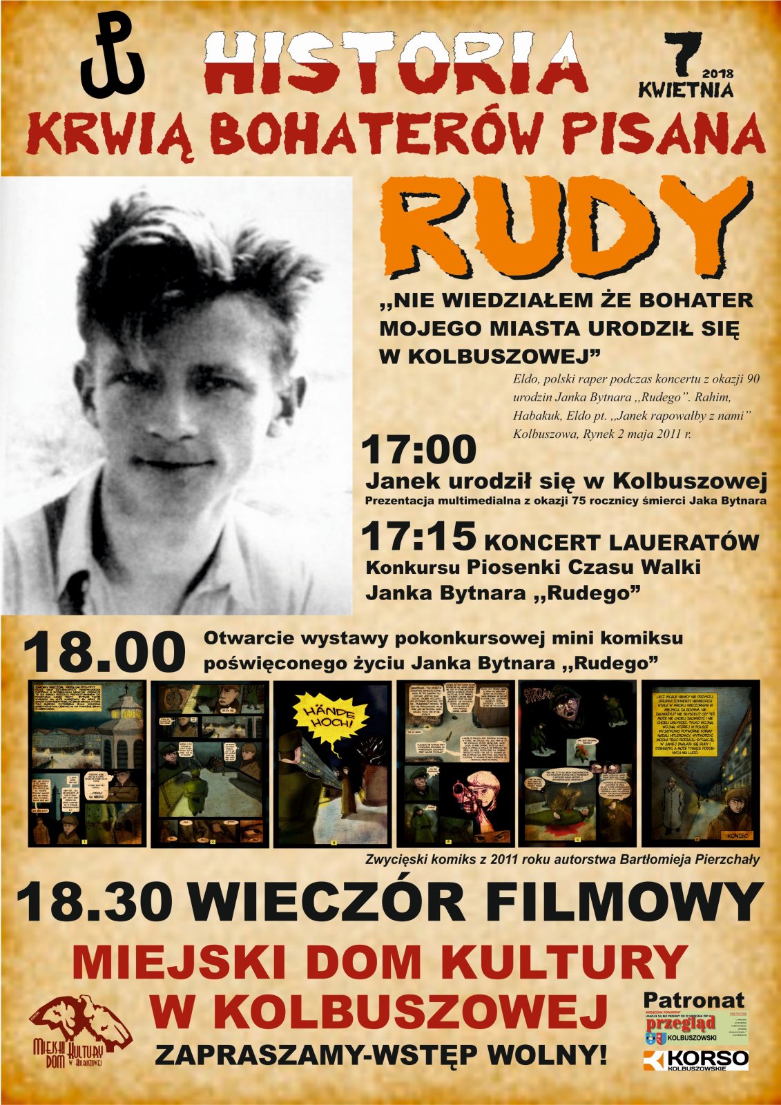 - godz. 18.00 - otwarcie wystawy pokonkursowej mini komiksu poświęconego życiu Janka Bytnara "Rudego" - zwycięski konkurs z 2011 roku autorstwa Bartłomieja Pierzchały