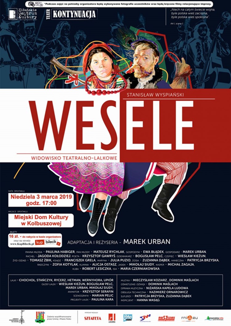 Miejski Dom Kultury zaprasza wszystkich na widowisko teatralno-lalkowe pt. „Wesele” przygotowane przez Teatr „Kontynuacja” w reżyserii Marka Urbana. Spektakl odbędzie się 3 marca (niedziela) o godz. 17.00 w Miejskim Domu Kultury w Kolbuszowej.