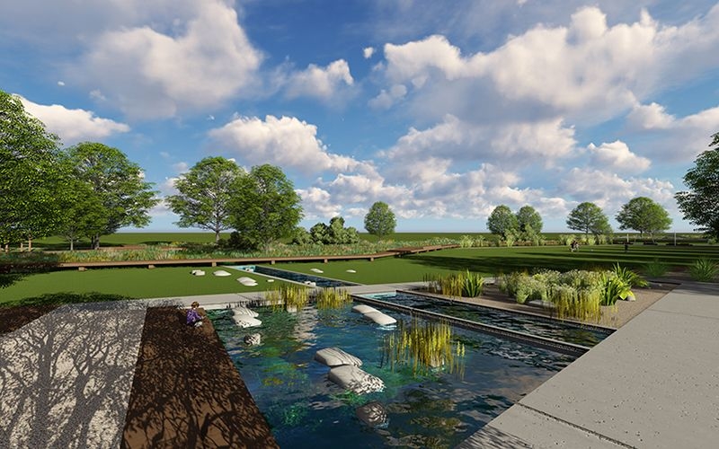 Pojawią się również ścieżki z betonu dekoracyjnego. Zobaczymy także place betonowe. Architekci nie zapomnieli o zaprojektowaniu rabat wzdłuż alei dębowej. Nie zabraknie również drzew i krzewów w strefie reprezentacyjnej oraz ekologicznej części parku. Oprócz łąki kwietnej zostanie założony ogród żwirowy. Konserwacji zostanie poddany rów melioracyjny.
