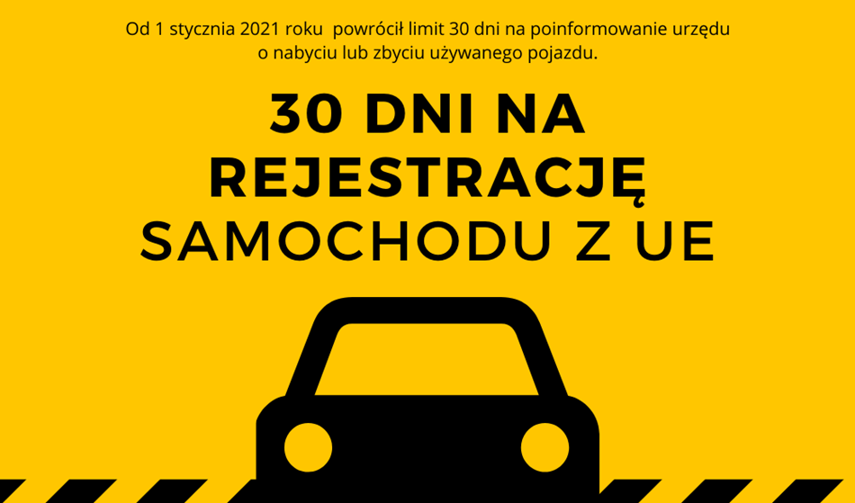 - Przywrócony termin 30-dniowy na wykonanie powyższych czynności dotyczy pojazdów sprowadzonych, nabytych lub zbytych po 31 grudnia 2020 r. Pojazdy sprowadzone, nabyte lub zbyte w okresie od 1 marca 2020 r. do 31 grudnia 2020 r. zachowują termin 180-dniowy na dopełnienie ww. czynności