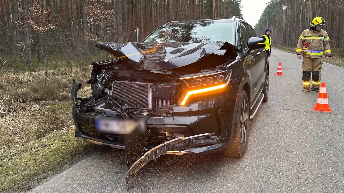 58-letni mężczyzna kierujący samochodem osobowym marki Kia, z tablicami rejestracyjnymi zaczynającymi się od „RMI”, potrącił przebiegającego przez jezdnię jelenia (prawdopodobnie). Zwierzę, mimo zderzenia, oddaliło się w głąb lasu.Na miejsce przybyli strażacy OSP i policjanci. Ze względu na powstałe uszkodzenia funkcjonariusze zatrzymali dowód rejestracyjny samochodu. Na szczęście kierowca nie odniósł żadnych obrażeń i nie wymagał pomocy medycznej. Przez kilkadziesiąt minut ruch odbywał się wahadłowo - do czasu zabrania pojazdu przez lawetę.