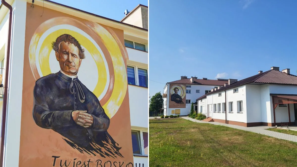 Malunek na zewnętrznej ścianie szkoły podstawowej przedstawia patrona placówki - św. Jana Bosko. Mural liczy ponad 12 metrów kwadratowych i powstał na przełomie czerwca i lipca tego roku. Jego autorem jest Wojciech Kaszub z Przecławia.