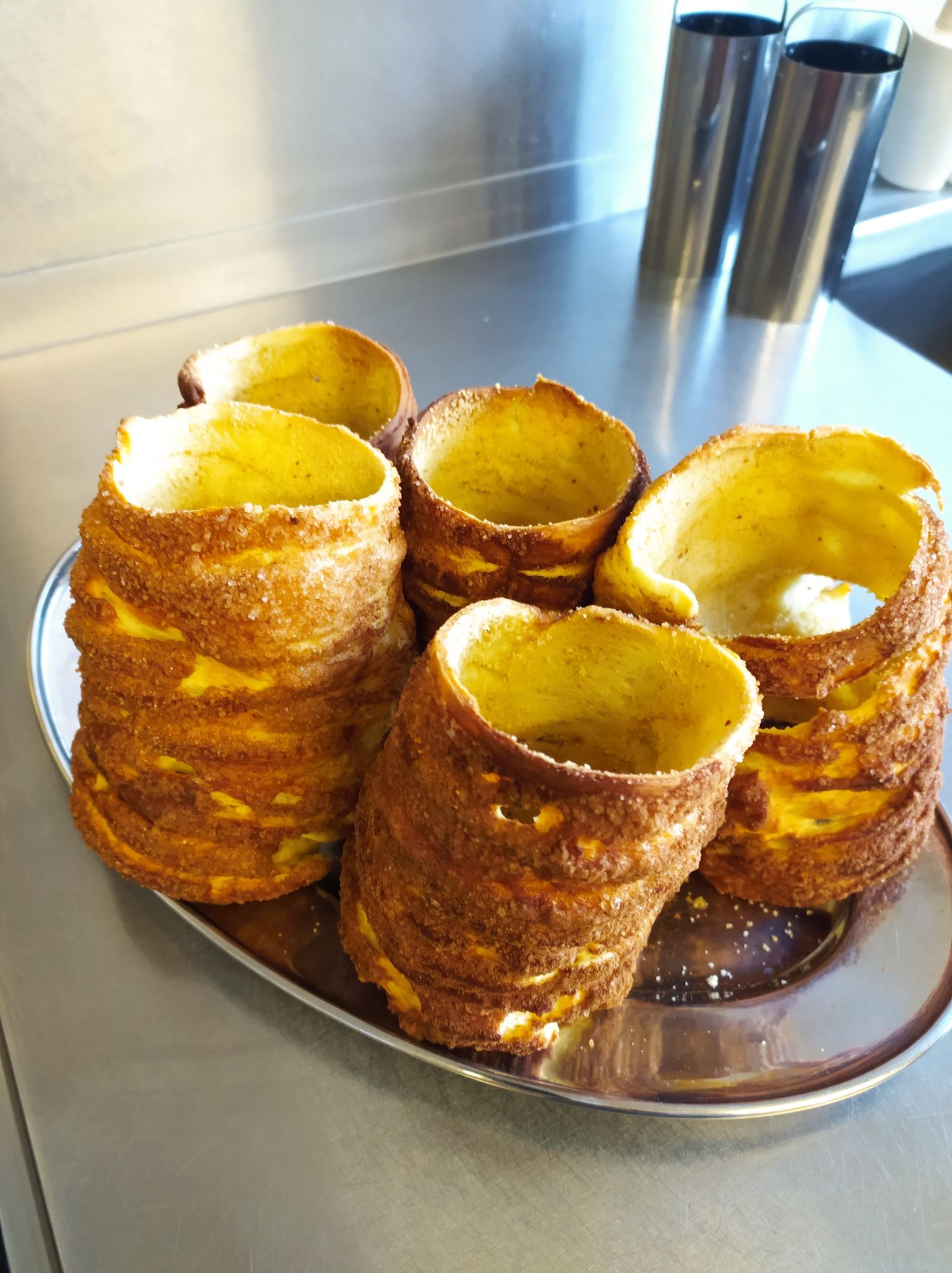 Ciasto partiami rozwałkowywać, ciąć paski o szerokości 1-1,5 cm i długości ok. 15 -20 cm. Nawijać na foremki pas ciasta tak, aby jeden brzeg ciasta zachodził na poprzedni. Wierzchnią część posmarować białkiem jaja, następnie obtoczyć w cukrze wymieszanym z cynamonem. Rurki ułożyć na blaszce na stojąco lub leżąco, zachowując odstępy ok. 4 cm. Piec w gorącym piekarniku na złoty kolor około 20 minut.