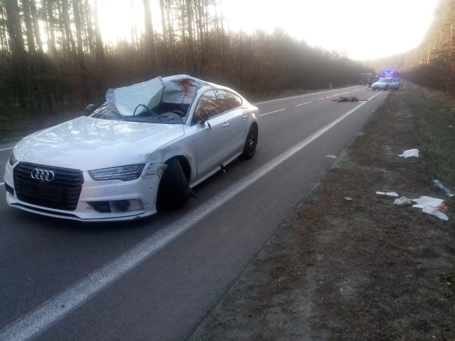 Niestety kierowca audi nie zdołał uniknąć zderzenia ze zwierzęciem, które uderzyło w pojazd i zginęło na miejscu.