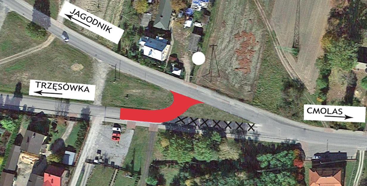 Pierwszeństwo mają kierowcy jadący w kierunku Jagodnika, choć na pierwszy rzut oka droga główna prowadzi do Trzęsówki, co może mylić kierowców, szczególnie przyjezdnych. Trakt relacji Cmolas Trzęsówka ma zostać jednak przesunięty i doprowadzony do głównej drogi tak, aby nie było już wątpliwości co do pierwszeństwa przejazdu.