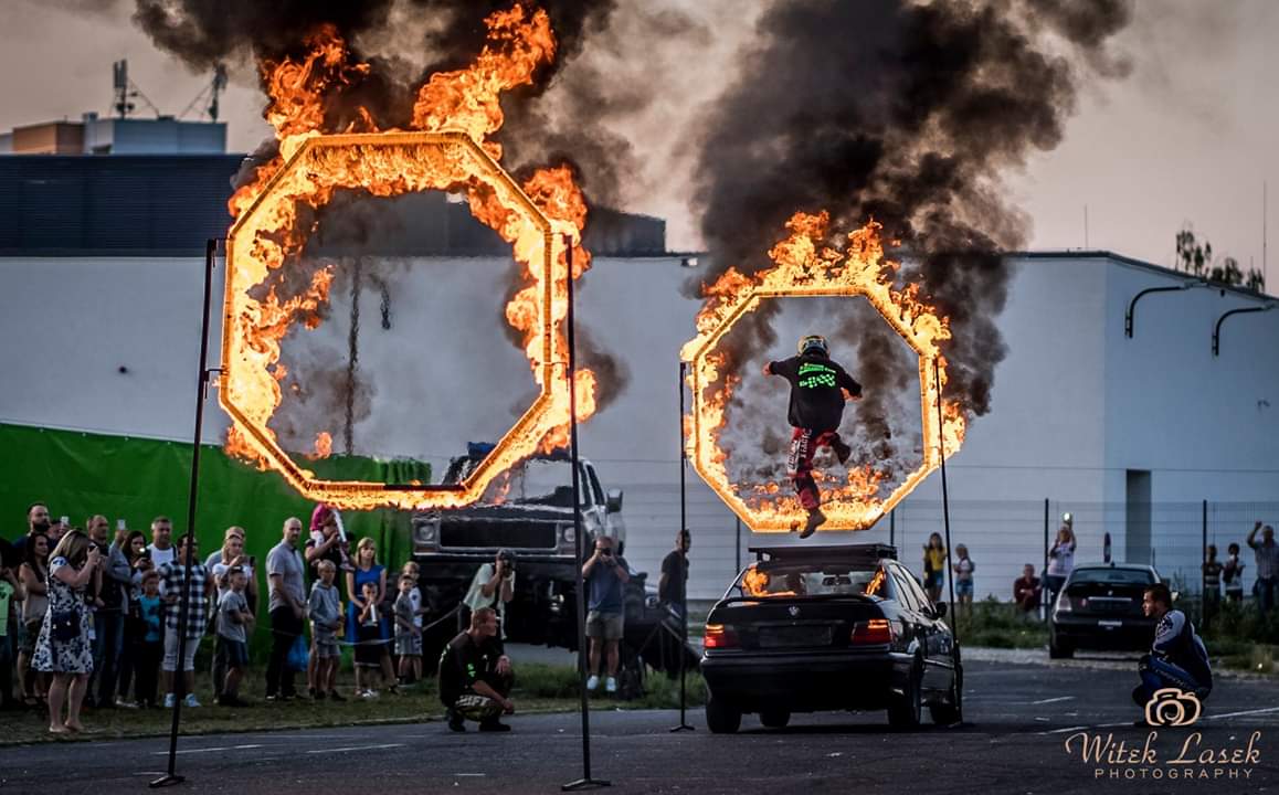 - przejazd przez ścianę ognia z człowiekiem na masce pojazdu