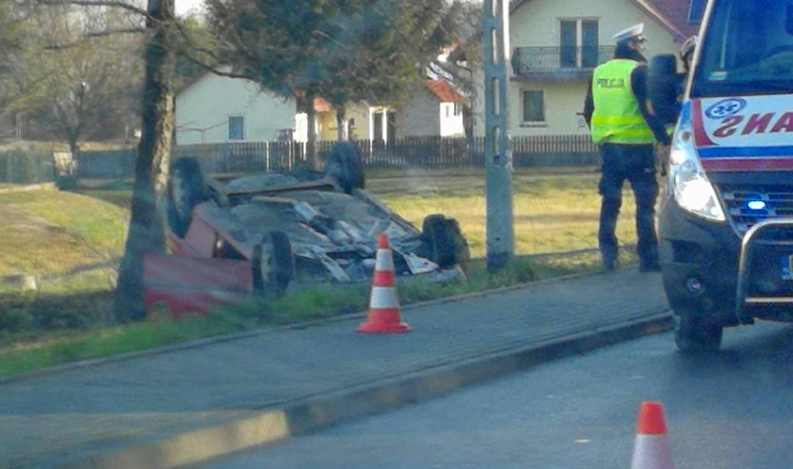 Po godz. 9 mundurowi otrzymali zgłoszenie o dachowaniu samochodu osobowego, z którego zaczął się wydobywać dym.