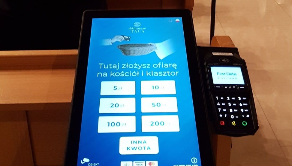 - Odpowiadając na Wasze prośby wynikające z obecnej sytuacji epidemicznej, w której wszyscy się znaleźliśmy, umieściliśmy z tyłu kościoła, przy wyjściu elektroniczną tacę, czyli możliwość składania ofiar bezgotówkowo