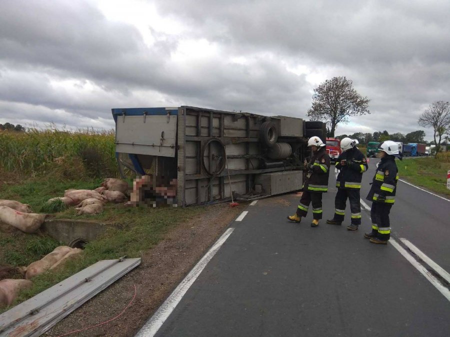 Do zdarzenia doszło dziś (poniedziałek, 24 września) po godz. 9 na drodze krajowej nr 77 w miejscowości Dębno w powiecie leżajskim. Ze wstępnych ustaleń wnika, że od ciężarówki przewożącej trzodę chlewną odpięła się naczepa, która przewróciła się na bok. Część świń wydostała się z uszkodzonej naczepy i rozeszła po pobliskich polach.
