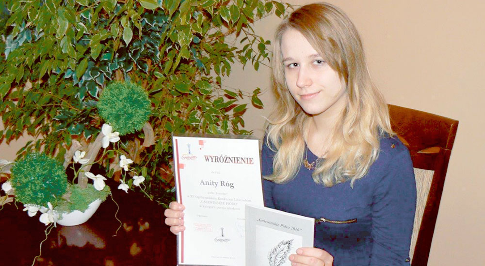 – Anita, w kategorii poezja, zdobyła pierwsze wyróżnienie. Dodać należy, iż w tegorocznej edycji konkursu wzięło udział 322 uczestników z Polski i z zagranicy – cieszy się nauczycielka. Na tym nie koniec sukcesów młodej poetki. Anita zajęła I miejsce w VIII edycji Ogólnopolskiego Otwartego Konkursu Literackiego 2016 „O różę Karoliny” w kategorii poezja. Organizatorem tego konkursu był Namysłowski Ośrodek Kultury oraz Biblioteka Publiczna w Namysłowie. - Zarówno w pierwszym, jak i w drugim konkursie nagrodzone i wyróżnione wiersze ukazały się w pokonkursowych almanachach. Ponadto Anita otrzymała dyplomy i nagrody rzeczowe – zaznacza Władysława Stolarz.
