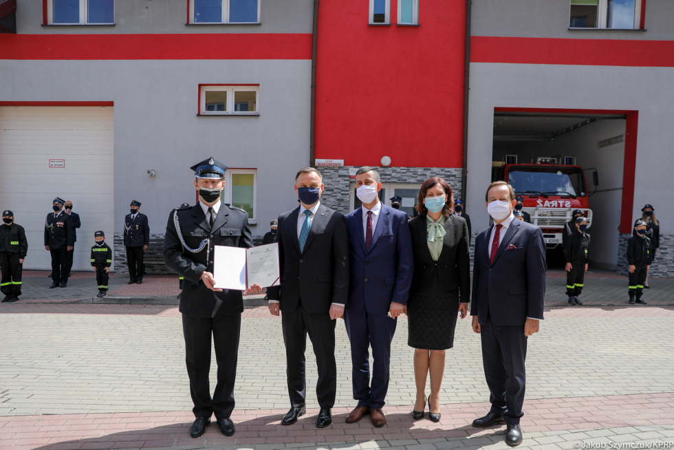 Prezydent wziął udział w uroczystym przekazaniu promesy na zakup samochodów ratowniczo-gaśniczych. Wcześniej Prezydent, złożył hołd przed pomnikiem ku czci walczących o Niepodległość Polski. W tym miejscu stał pomnik Józefa Piłsudskiego. Nie przetrwał wojny. W roku Stulecia Odzyskania przez Polskę Niepodległości została odsłonięta tablica upamiętniająca Marszałka.