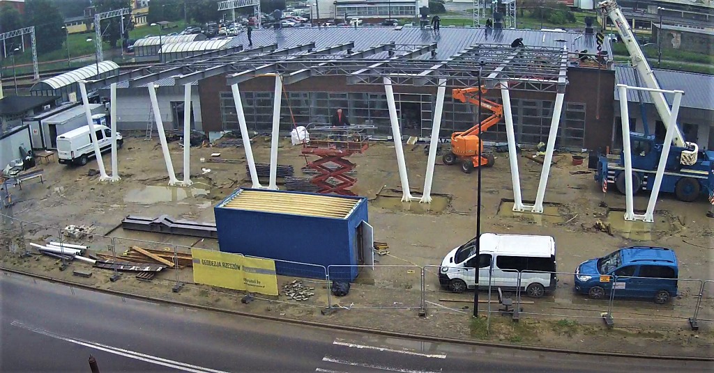 Obecnie na ostatnim etapie są prace przy wykończeniu elewacji budynku dworca. Wykonawca przystąpił do montażu stalowej konstrukcji zadaszenia przystanków autobusowych. Wewnątrz budynku ukończono ścianki działowe oraz kontynuowane są roboty instalacyjne.