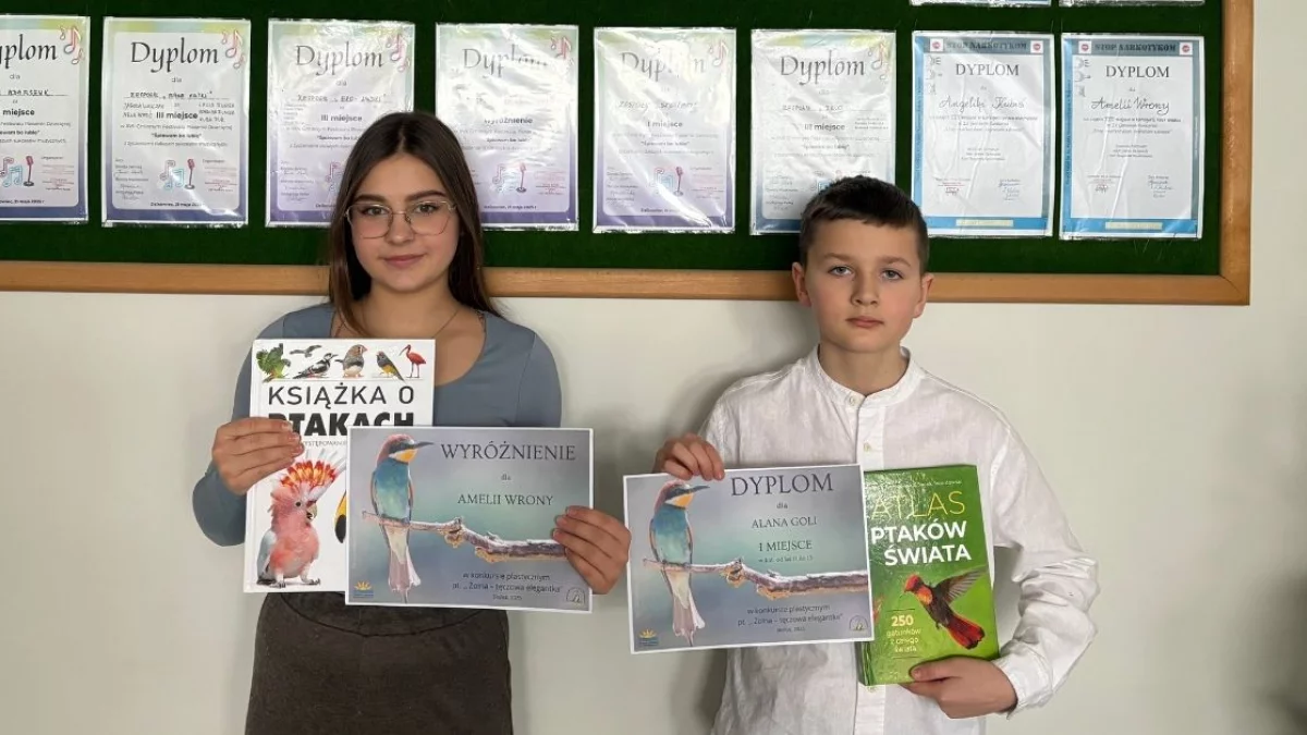 Z przyjemnością informujemy, że wśród nagrodzonych znalazł się Alan Gola, uczeń klasy V, który zdobył I miejsce za swoją pracę, która dodatkowo ozdobi kalendarz Rzeczpospolitej Ptasiej na rok 2026. Natomiast Amelia Wrona, uczennica klasy 7, została wyróżniona za swoją pracę, która również spotkała się z dużym uznaniem.