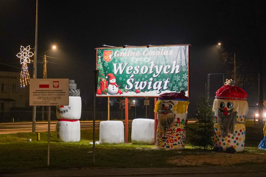Na latarniach w centrum Cmolasu zawisły kolorowe ozdoby, które rozświetlają mroźne, zimowe wieczory, dodając uroku całemu otoczeniu. W sercu wioski, przed urzędem gminy, stanęły choinki, które z dumą prezentują się w pełnej krasie, przyozdobione świątecznymi światełkami i ozdobami.