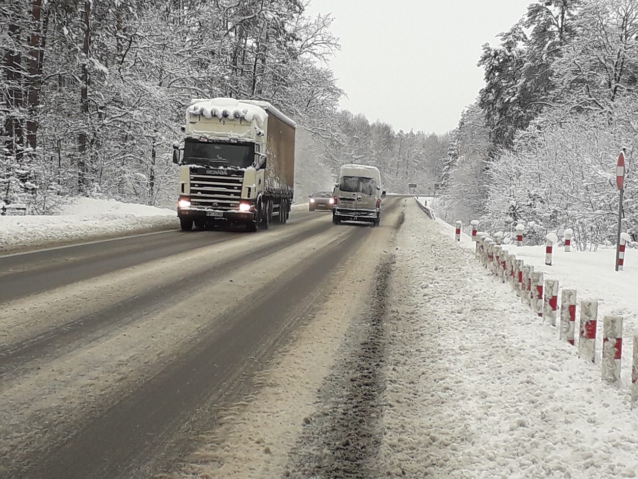 Bardzo niebezpiecznie jest na drodze Kolbuszowa – Mielec, gdzie warstwa błota pośniegowego i lodu jest dość duża. Jak widać na zdjęciach samochody po tej drodze poruszają się z trudem i bardzo wolno.