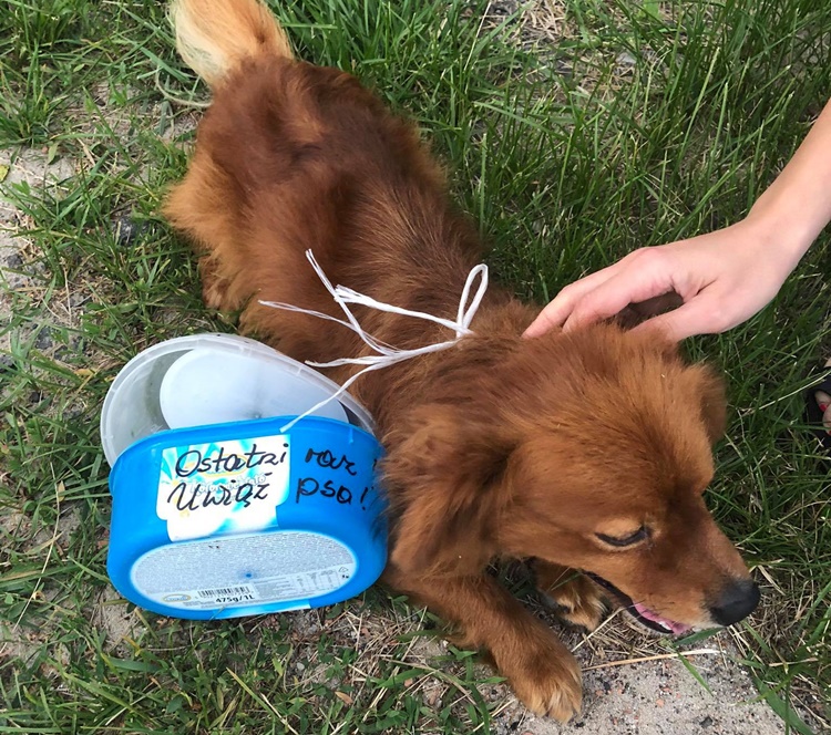 Przesłała nam również zdjęcia małego psa, którego prawdopodobnie ktoś złapał i zawiązał mu na szyi plastikowe pudełka. Dodatkowo widniały na nich napisy "uwiąż psa!", "nie żartuje".