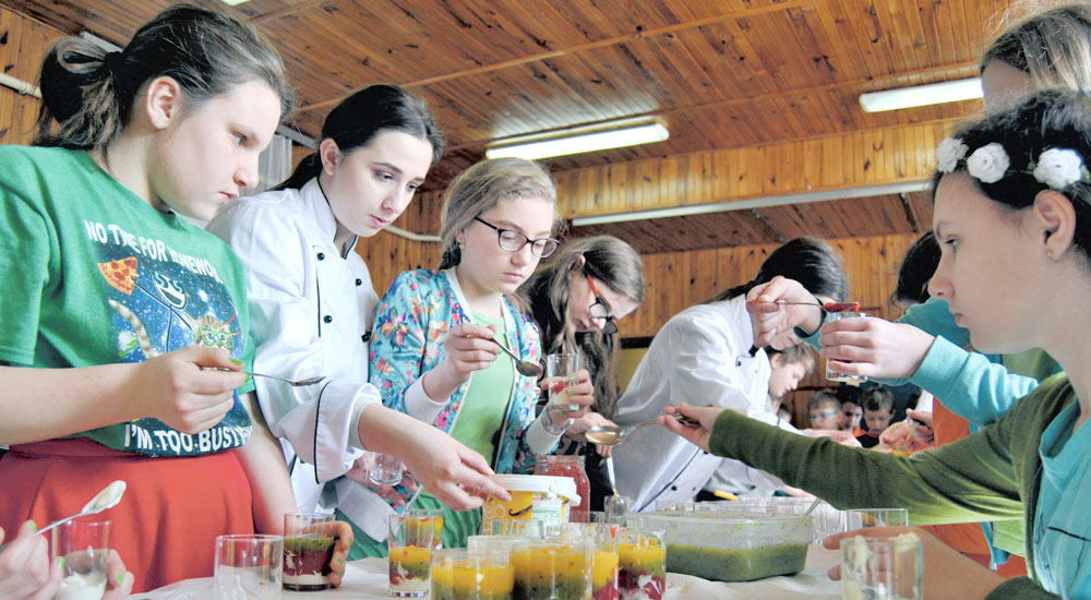 Następnie uczestnicy spotkania przeszli na jadalnię, gdzie odbyły się zajęcia praktyczne. Klasy starsze przygotowywały kanapeczki z wykorzystaniem różnych past, koreczki, desery z musów owocowych oraz paluszki warzywne z dipami. Dzieci młodsze tworzyły gąsieniczki owocowe, kanapeczki z wykorzystaniem różnych past i warzyw oraz desery z musów owocowych.