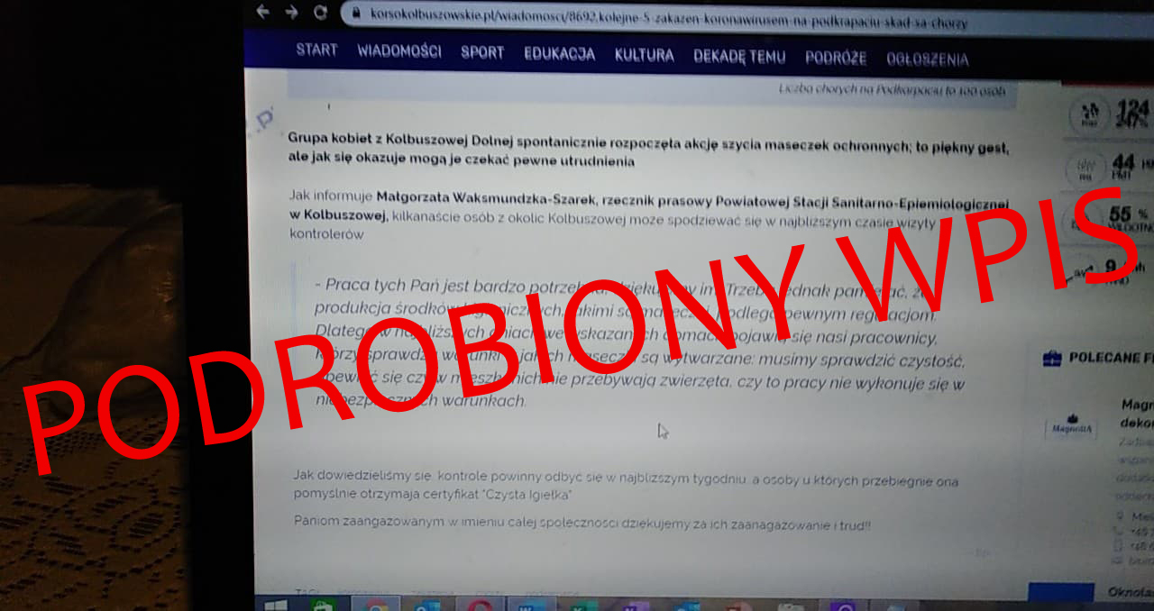 Wracamy do sprawy przerobionej treści posta zamieszczonego na portalu Korso Kolbuszowskie [pisaliśmy o tym tutaj: Kiepski żart z szyjących maseczki. Ktoś się podszywa pod Korso]. Jak się okazuje, w zmanipulowanej treści ktoś zawarł wypowiedź przedstawiciela Wojewody Podkarpackiego, który miał się wypowiedzieć na temat planowanych wizyt kontrolerów.