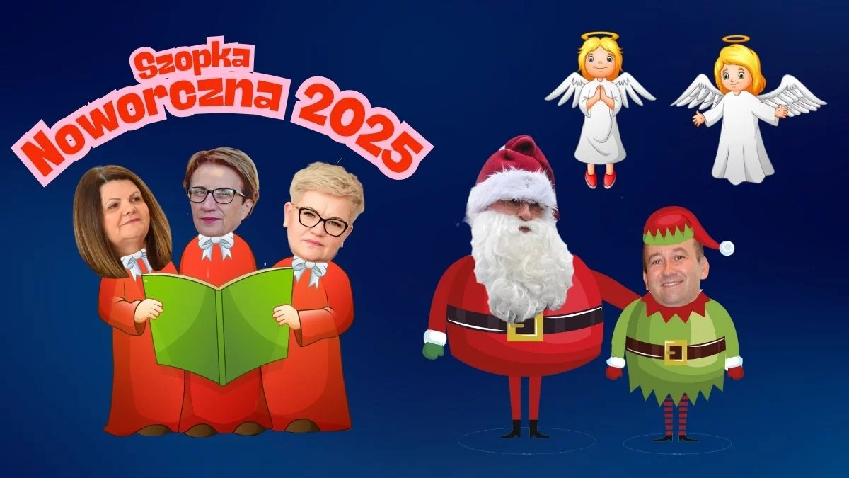 Nad szopką pojawiają się dwa aniołki, unosząc się nad ziemią i wskazując różne miejsca w powiecie kolbuszowskim.