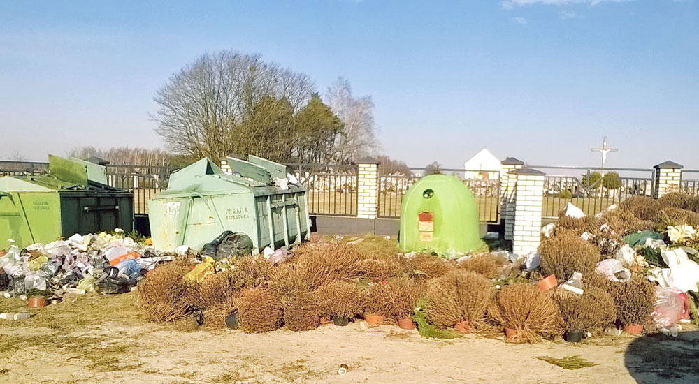 Nie po raz pierwszy cmentarz w Trzęsówce zwraca uwagę mieszkańców sołectwa. W ubiegłym roku jeden z naszych Czytelników informował o dość niekonwencjonalnym sposobie pozbywania się nadmiaru śmieci. Otóż na dzień przed uroczystością Wszystkich Świętych, kiedy odwiedzał groby bliskich, zastał przed cmentarzem wielkie ognisko. Dym, który unosił się z palącej sterty sztucznych kwiatów, doniczek, reklamówek, utrudniał normalne oddychanie. Proboszcz parafii tłumaczył nam wtedy, że on nigdy nie wypalał i nie zlecał wypalania śmieci.