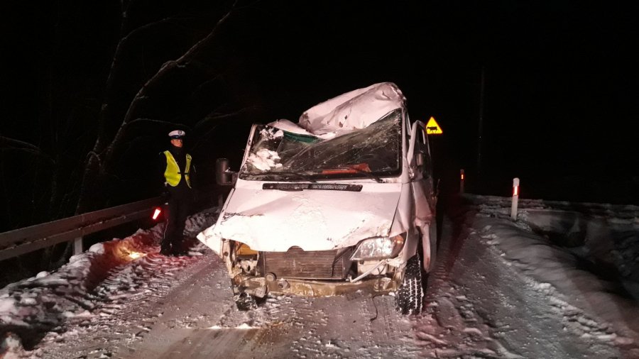 Po godz. 18, dyżurny z Leska otrzymał zgłoszenie o wypadku, do jakiego doszło w miejscowości Buk. Ze wstępnych ustaleń policjantów wynika, że 70-letni mężczyzna, przewoził mercedesem sprinterem jedenaścioro turystów. Brali oni udział w kuligu noworocznym. Na moście w miejscowości Buk, kierowca stracił panowanie nad pojazdem, przełamał bariery energochłonne i zjechał z drogi wywracając pojazd na dach.