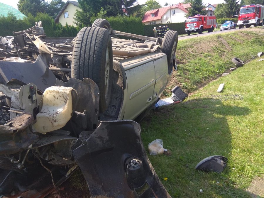 Wezwani przed godz. 14 na miejsce zdarzenia funkcjonariusze zastali dwa uszkodzone pojazdy, w tym jeden leżący na dachu.0