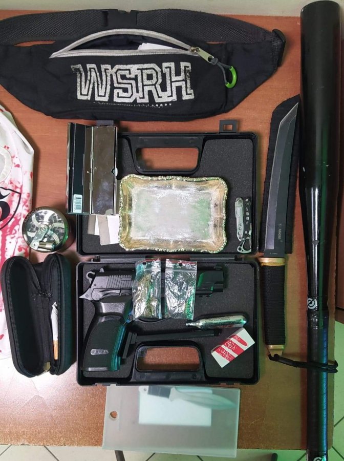 - Podczas kontroli osobistej, w kurtce mężczyzny policjanci ujawnili woreczek strunowy z zawartością białego proszku. Dodatkowo w samochodzie znaleźli kij baseballowy, kilka sztuk noży, kominiarkę, kilka telefonów komórkowych, pistolet gazowy oraz pieniądze i woreczki z suszem roślinnym.