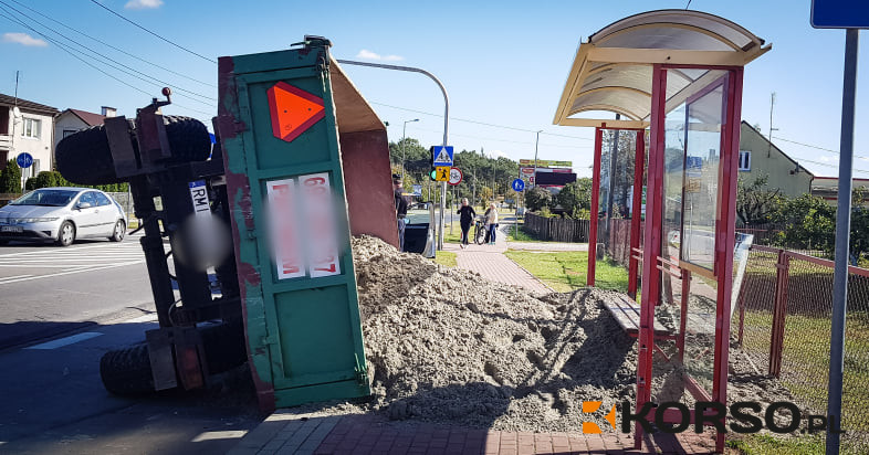 Z REGIONU. Traktor z przyczepą piasku przewrócił się na przystanek