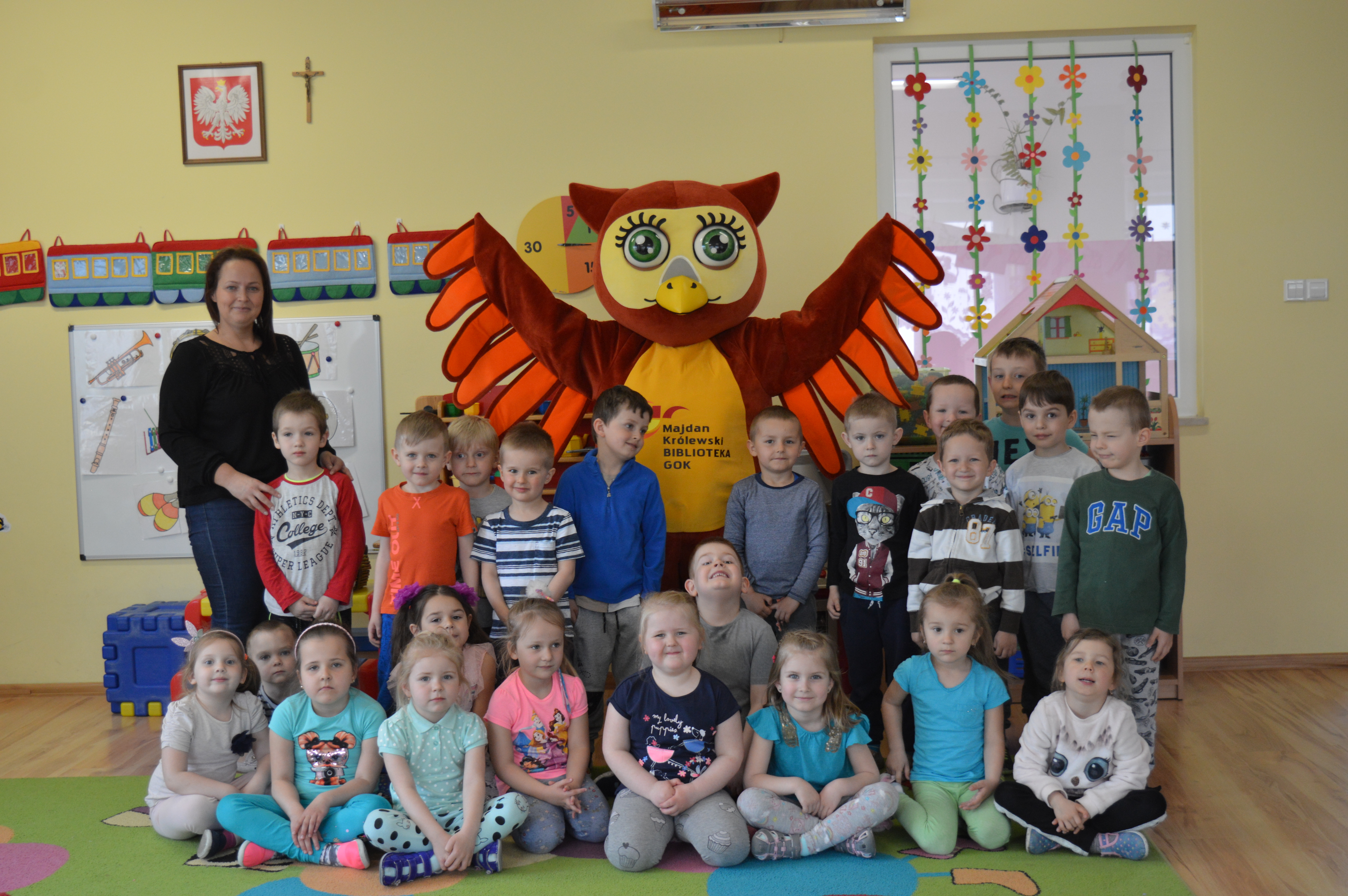 Podczas głośnego czytania dzieciaki odwiedziła sowa – maskotka biblioteki, która chętnie bawiła się z przedszkolakami, a na koniec poczęstowała wszystkich słodyczami.
