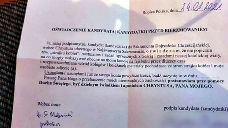 "Ja, niżej podpisany kandydat do Sakramentu Dojrzałości Chrześcijańskiej, wobec Chrystusa obecnego w Najświętszym Sakramencie oświadczam, że nie popieram tzw. "strajku kobiet" – oto fragment oświadczenia, które otrzymali kandydaci do sakramentu bierzmowania w parafii pw. Miłosierdzia Bożego w Ropicy Polskiej.