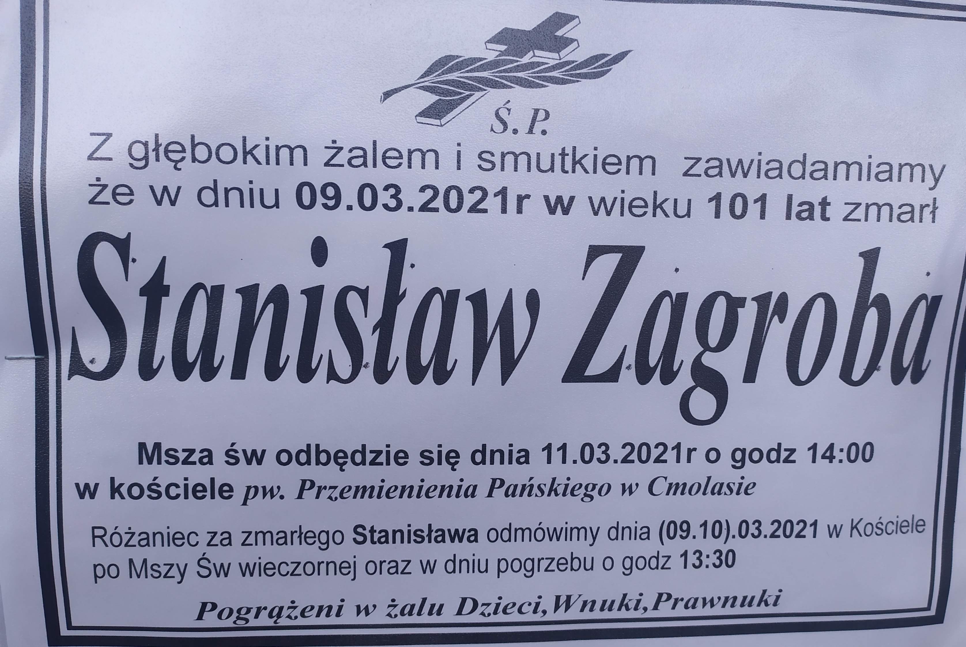 Pogrzeb ŚP. Stanisława Zagroby odbędzie się dziś (11 marca).