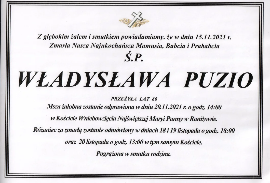 Różaniec za zmarłą zostanie odmówiony w czwartek i w piątek (18 i 19 listopada) o godz. 18 oraz w sobotę, 20 listopada, o godz. 13 w kościele w Raniżowie.